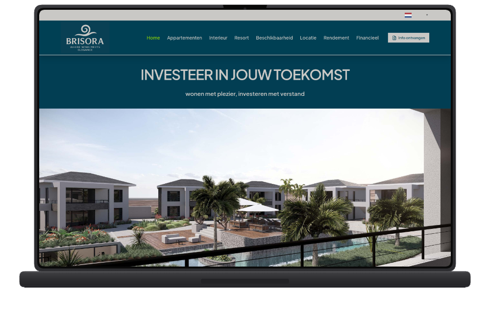 Brisora is een exclusief nieuwbouwproject op Curaçao: 44 luxe appartementen, een eigen parkeerplek, berging, twee verbonden zwembaden (lazy river) en een gedeelde gym. Een project met Europese bouwstandaarden en hoogwaardige materialen, dus ook de website moest dat niveau uitstralen. Samen met makelaar Kostabon ontwikkelden we een online ervaring die zowel inspireert als informeert.